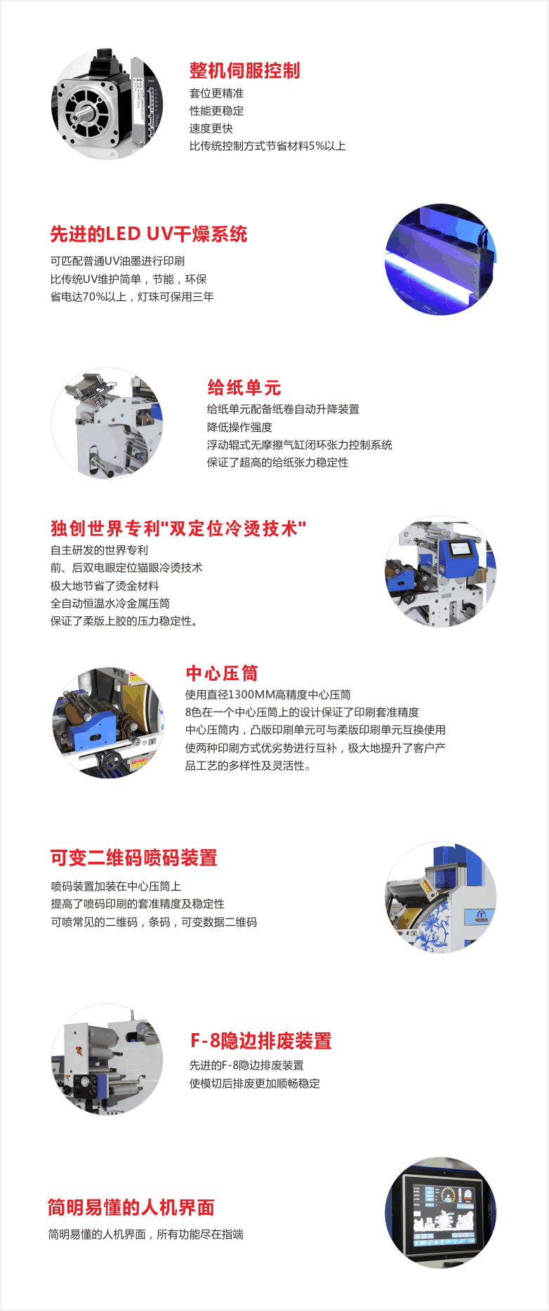 用途廣泛的靈活的印刷工藝組合;全伺服自動控制,承印物適應范圍寬闊,套準精度高;操作簡單,工作穩定。