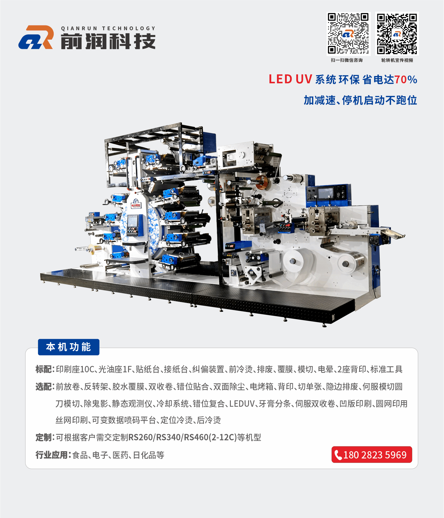 主營設備:商標印刷機、衛星式輪轉印刷機、模切機 等產品,公司可為客戶量身制定商標機、輪轉機等自動化解決方案。公司有強大的研發體系,確保能為客戶量身定制各類非標且最有價值的產品;前潤機械在國內外擁有極高的市場占有率及良好的信譽,贏得了眾多知名企業的青睞與合作,產品暢銷多個國家和地區,市場銷量近萬臺;我們愿與您攜手合作,建立長久雙贏機制,共享成功喜悅!加盟熱線:133 2260 8282